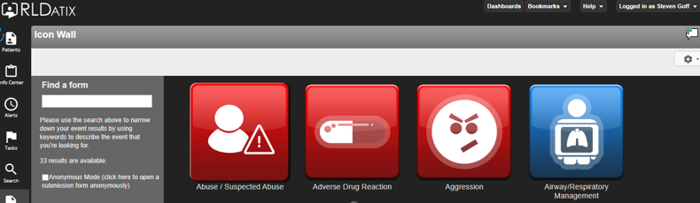 You will then be prompted to the home screen within the RL-Datix Patient Safety reporting system. (Hint: You will automatically be on the Icon Wall Screen).