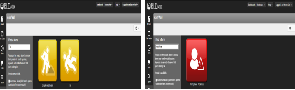 From that screen you can choose the type of safety event that needs to be entered. If you are unsure of the type of Icon to select, you can always use the “Find a form search” located on the screen. This will bring up all Icons that are associated with your search topic. Hint: See examples of searching for “Fall” or “Workplace Violence.”