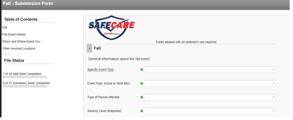 After selecting your icon topic, you will be prompted to the submission form for that safety event. Please remember that all Green are required fields that must be completed.